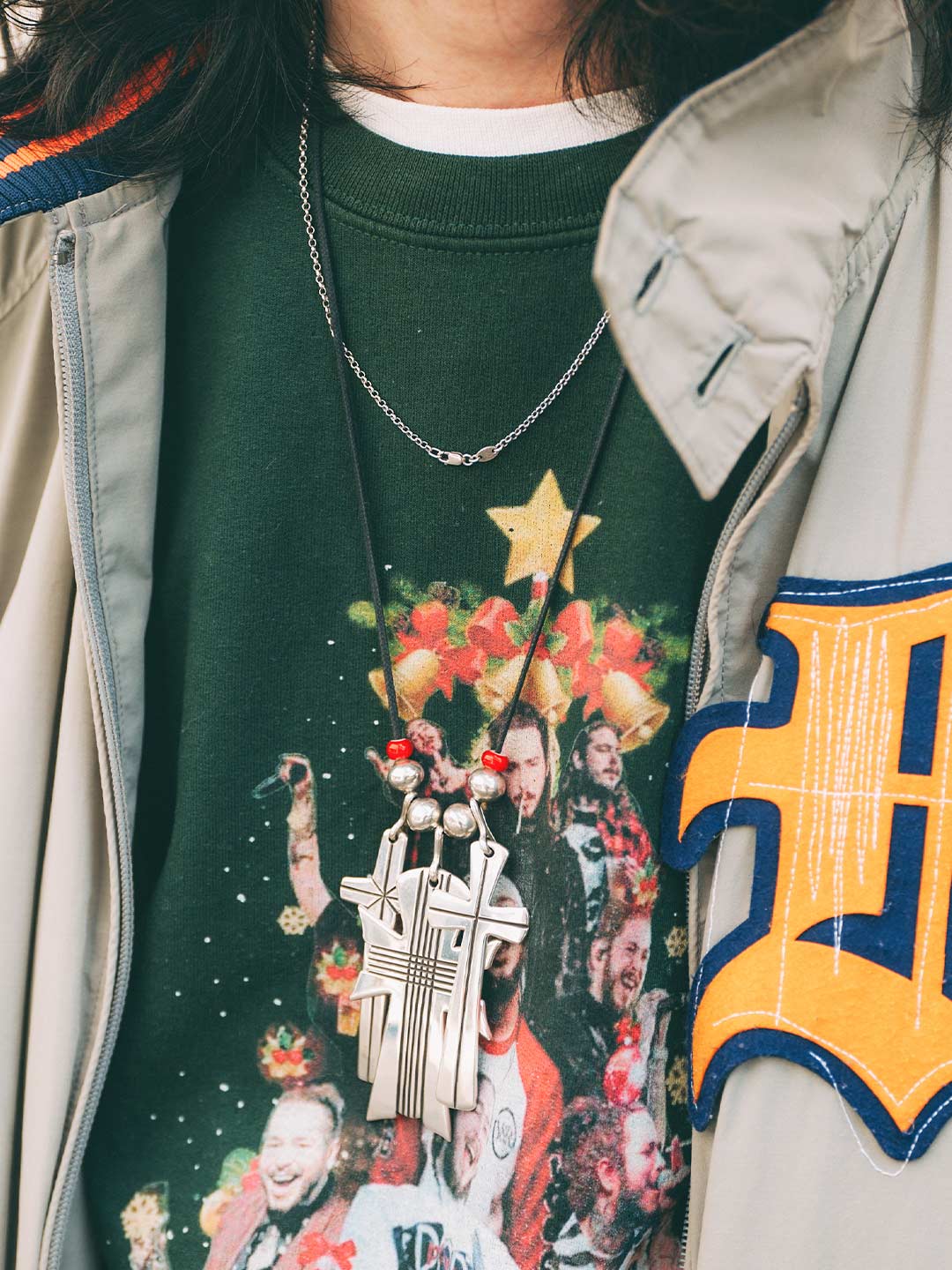 『シッピー クレイジー ホース』のシルバーネックレスをオン! カジュアルコーデも一気に引き締まる。