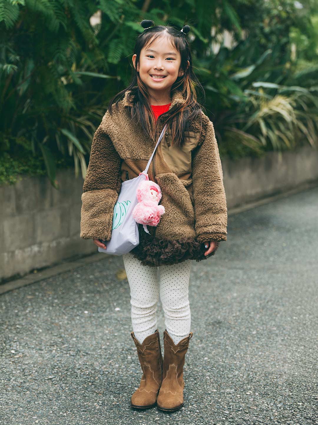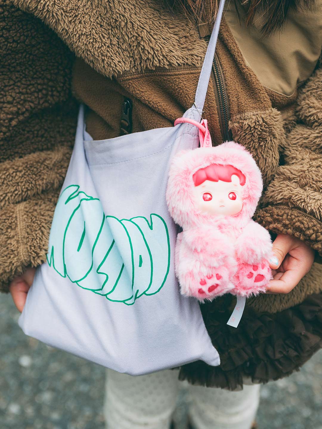 ラベンダーカラーのバッグで冬コーデに華やかをプラス! 『ポップマート』の「ハチププ」を連れて、キッズらしい遊び心を演出。