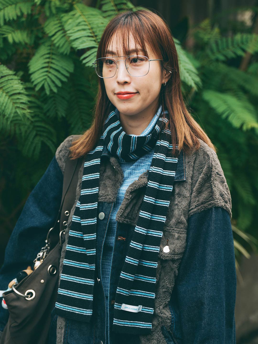 『ロウクラシック』のボーダーマフラーが楽しげなアクセントに。シルバーフレームのメガネで緊張感を漂わせたのがグッド!