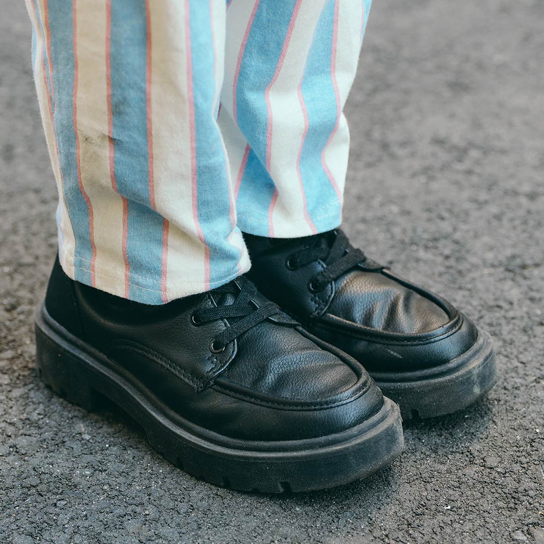ブラックのシューズがコーデ全体をキリッと引き締めてくれる。プラットフォームデザインで今っぽさも抜かりなし。