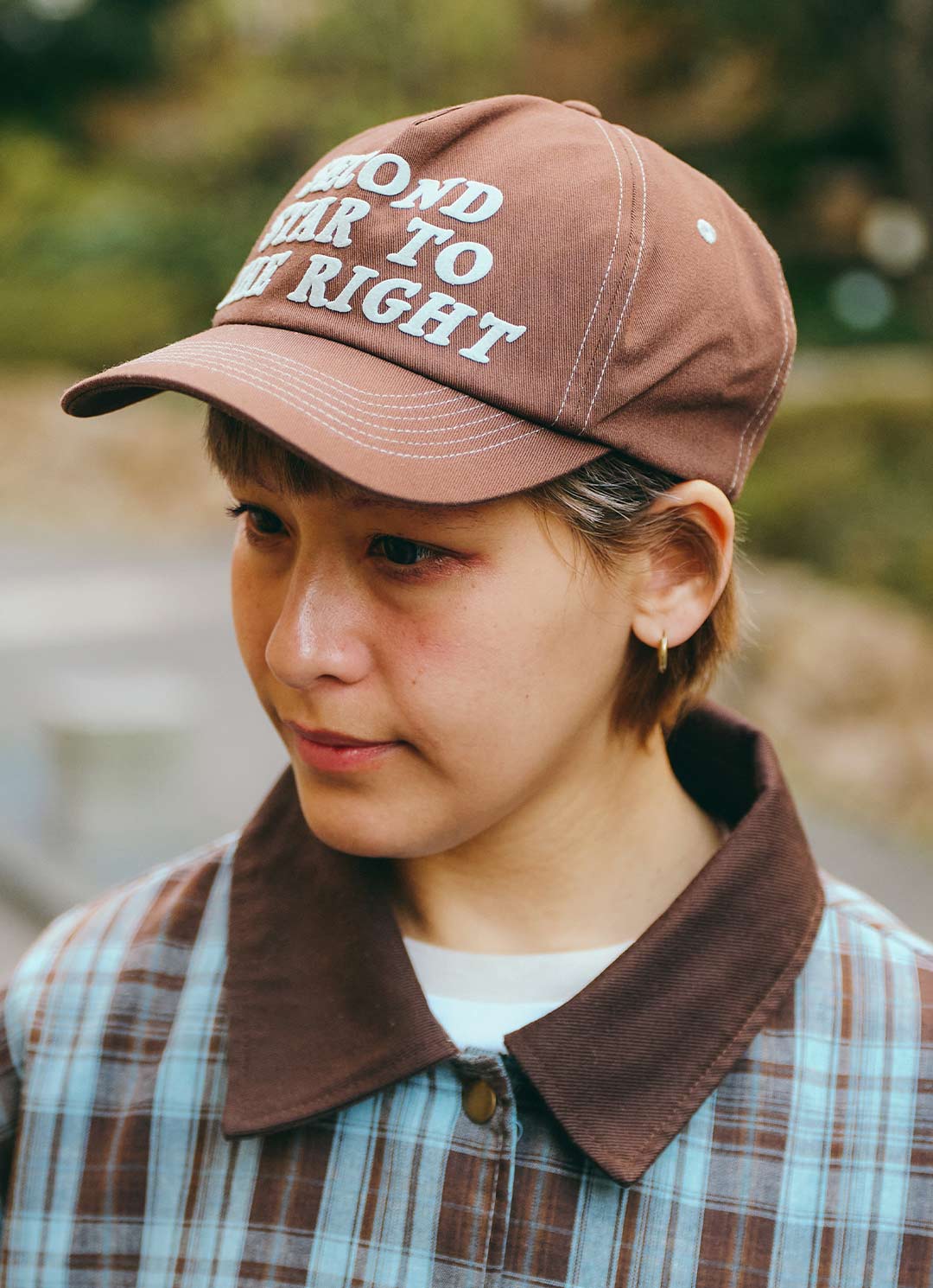 ブラウンのキャップがコーデのカラートーンを統一するキーアイテム。ミニマムなゴールドピアスでアクセントをつけたのがグッド!