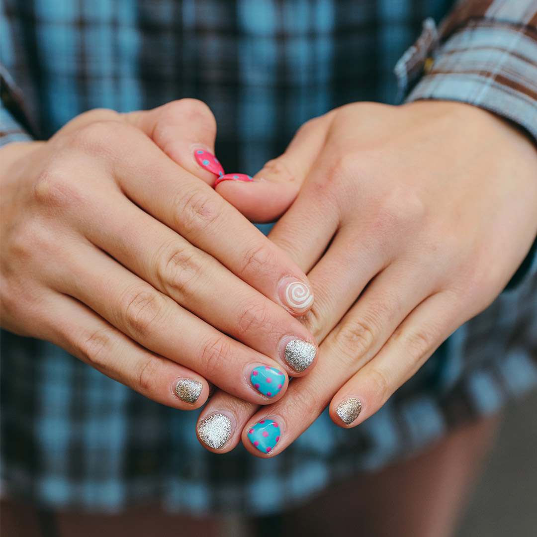 ポップなネイルアートに目が釘付け! キッズたちのコーデカラーとリンクさせた、遊び心あふれるディテールがおしゃれ。