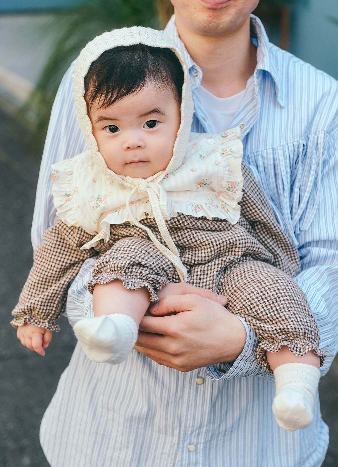 花柄のつけ襟とニットのバブーシュでロマンティックなベビースタイリング。色とテイストをシェアして、統一感ある顔周りに昇華!