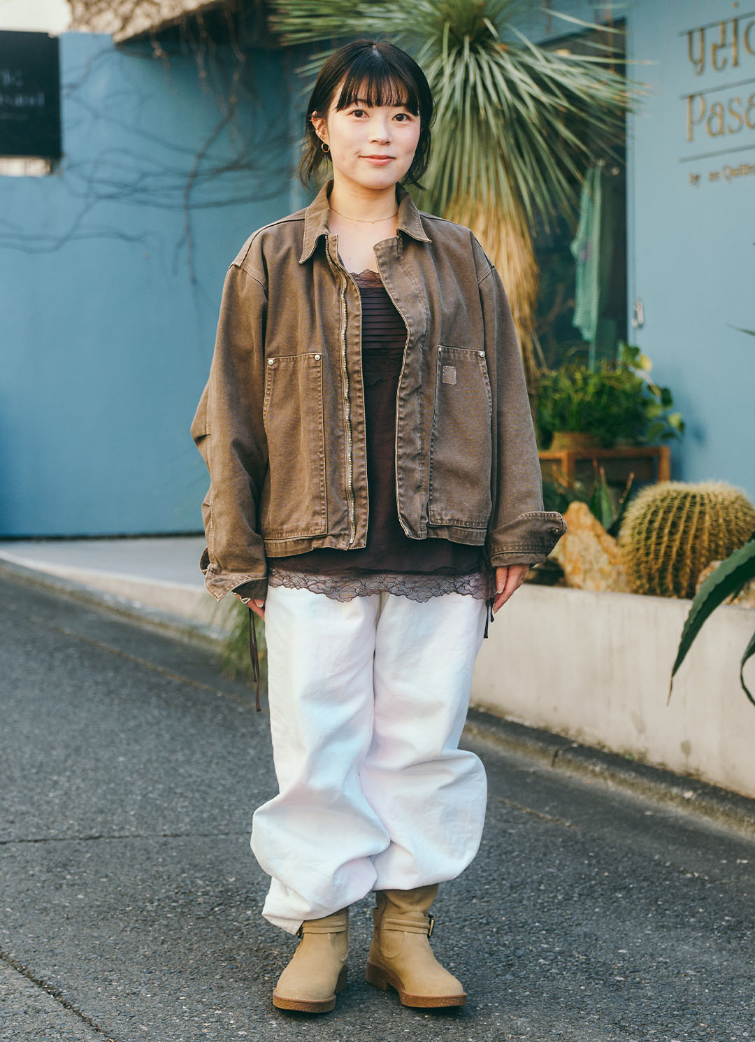 ベージュスエードシューズは、ホワイトボトムスとの相性抜群! まだ肌寒い日も、明るめカラーで季節を先取り♪