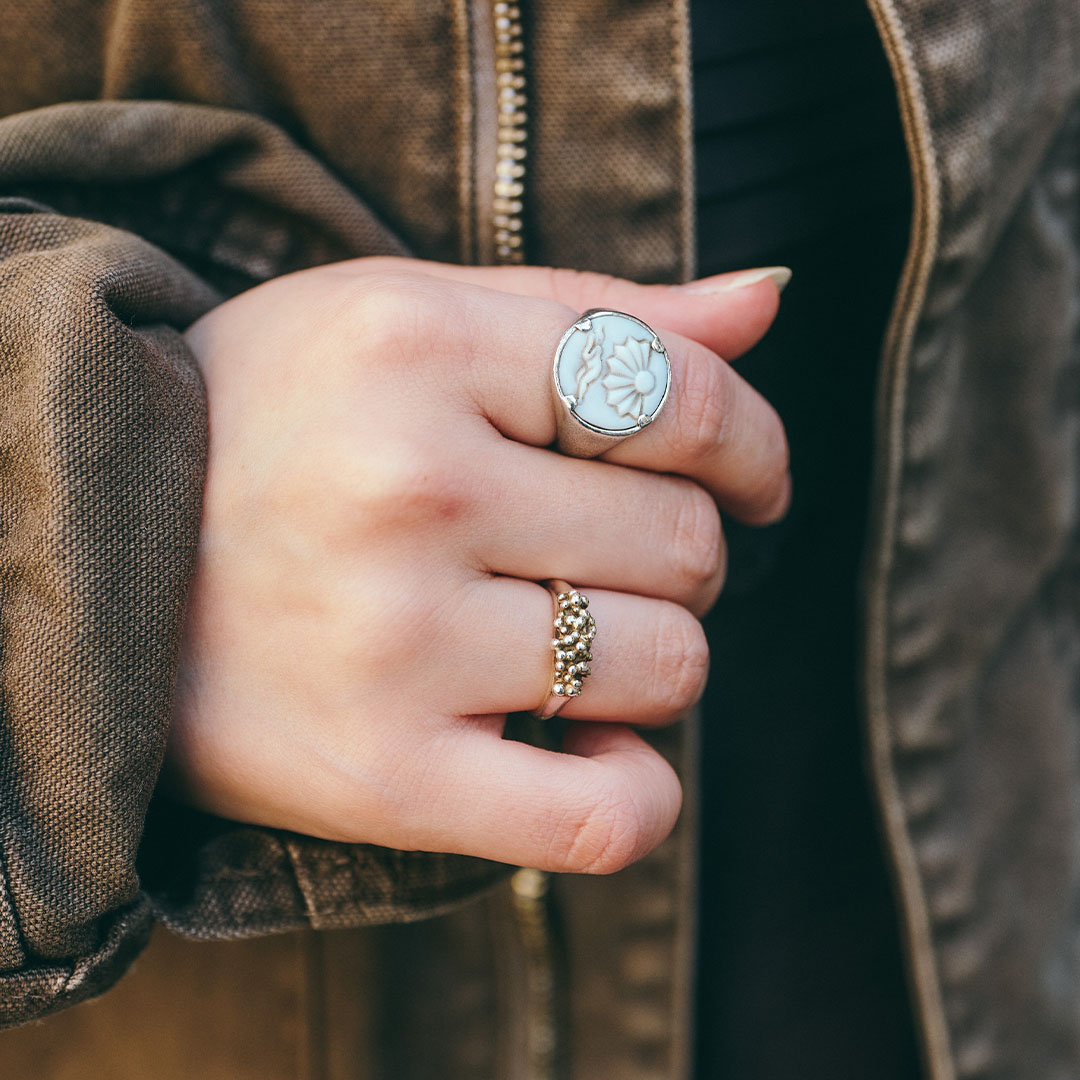 『トムウッド』のシグネットリングと『ガガン』のリングを重ねづけ。シルバーとゴールドのミックスで、手元を華やかに彩って。