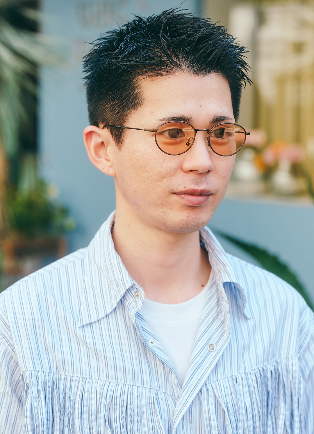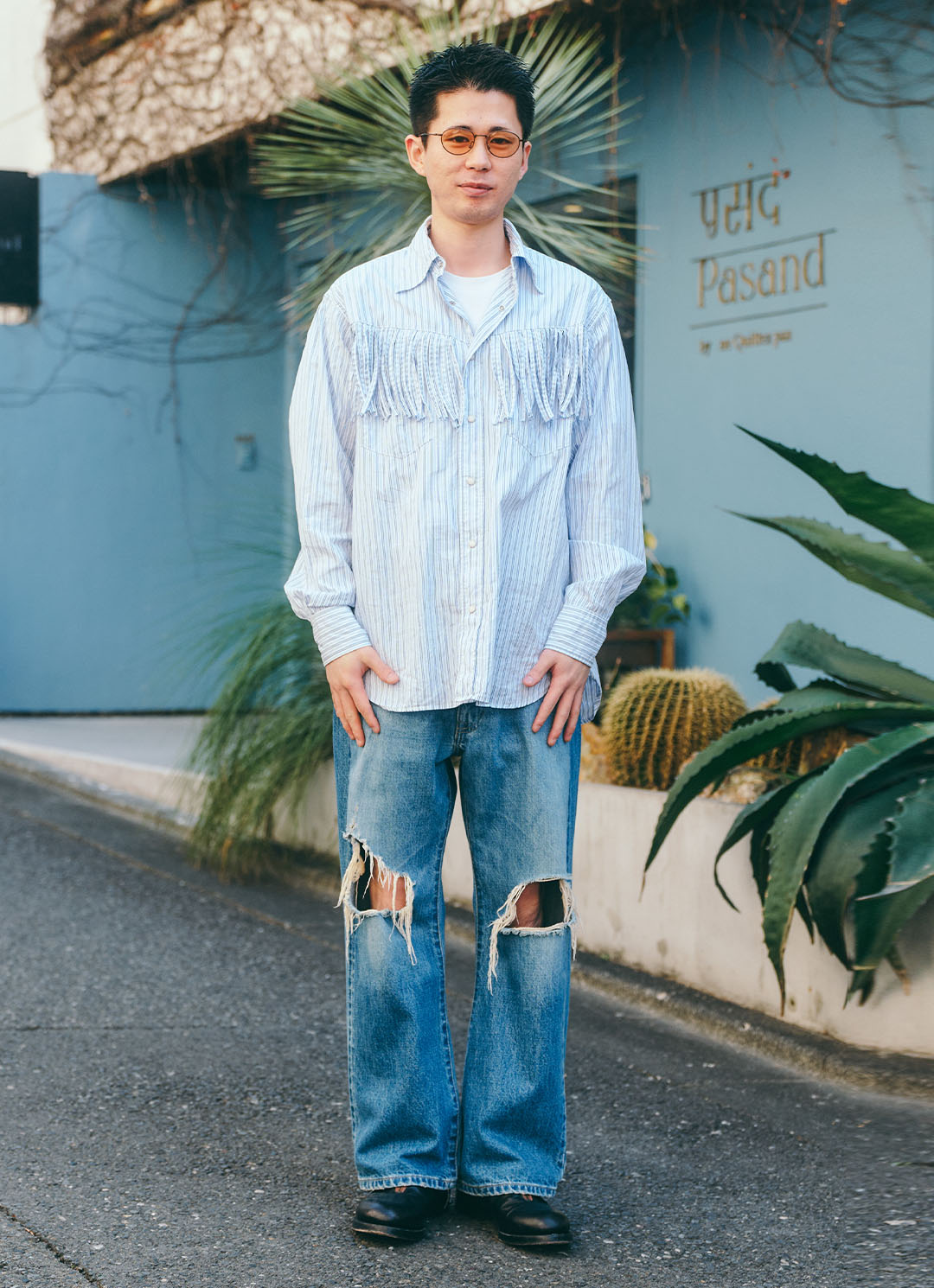 細めフレームのサングラスで緊張感をプラス。フリンジ付きのシャツで、コーデに奥行きを出したのがグッド!