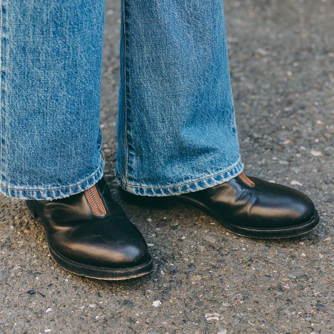 ダメージジーンズも、レザーシューズで都会的にアップデート。ちらりと見えるジッパーも好アクセントに。