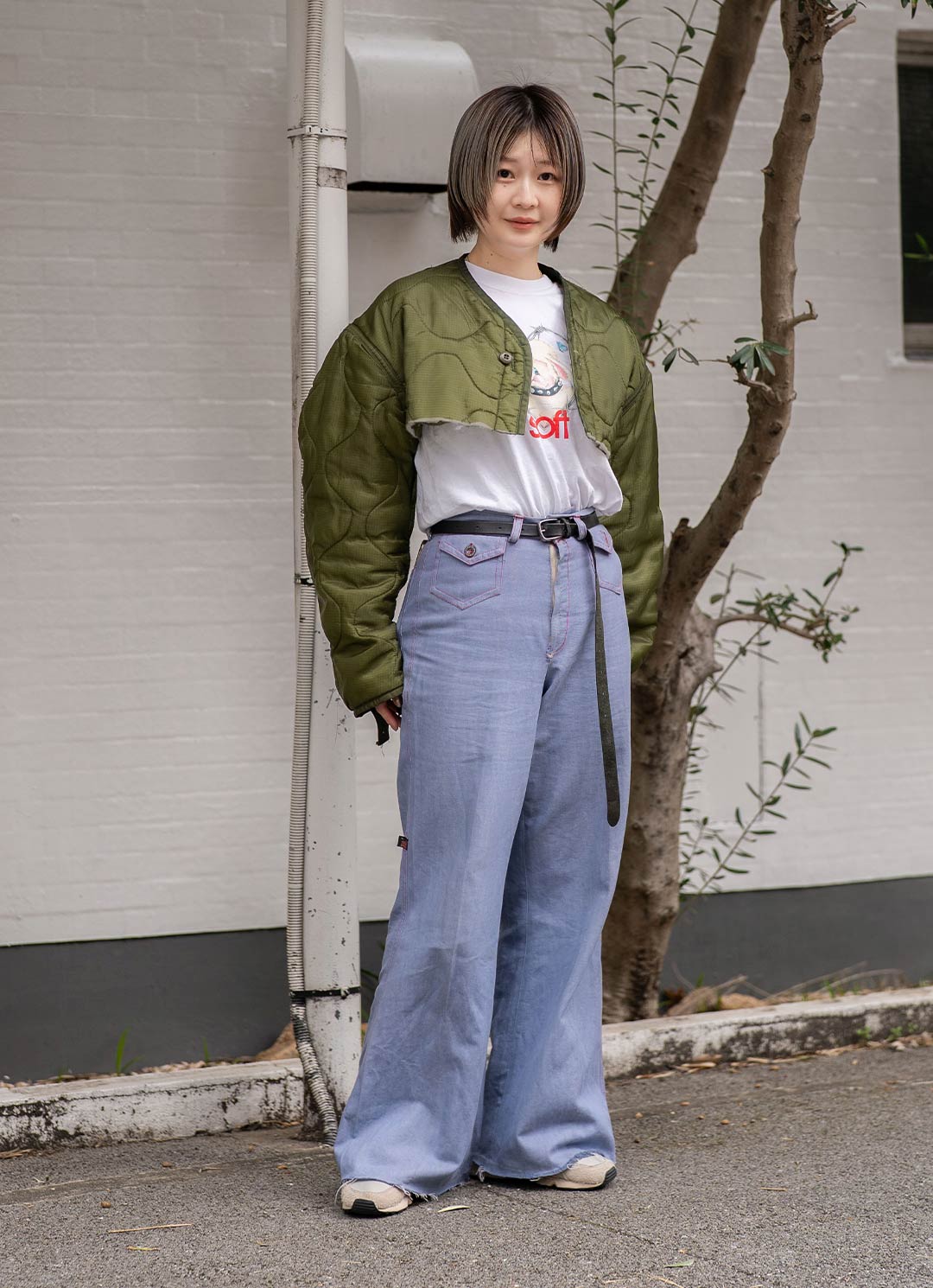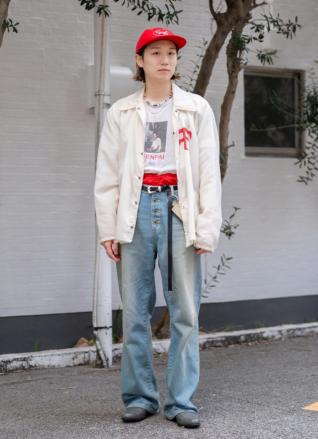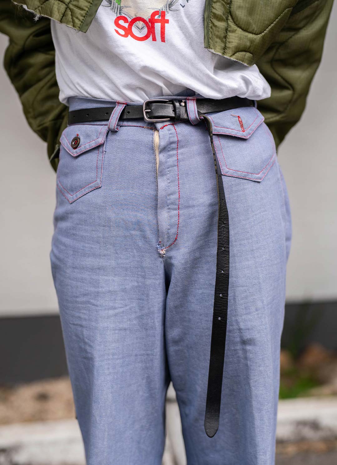 70年代のヴィンテージパンツは、レッドのステッチがさりげないアクセント。ブラックベルトを長めに垂らしたて動きをプラス!