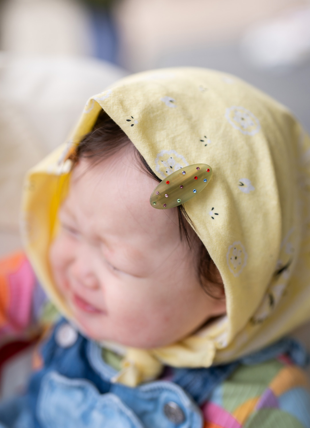 クリームイエローのバンダナを纏った春のご機嫌スタイル。『アウラ』のヘアアクセサリーでおしゃれ度アップ♪