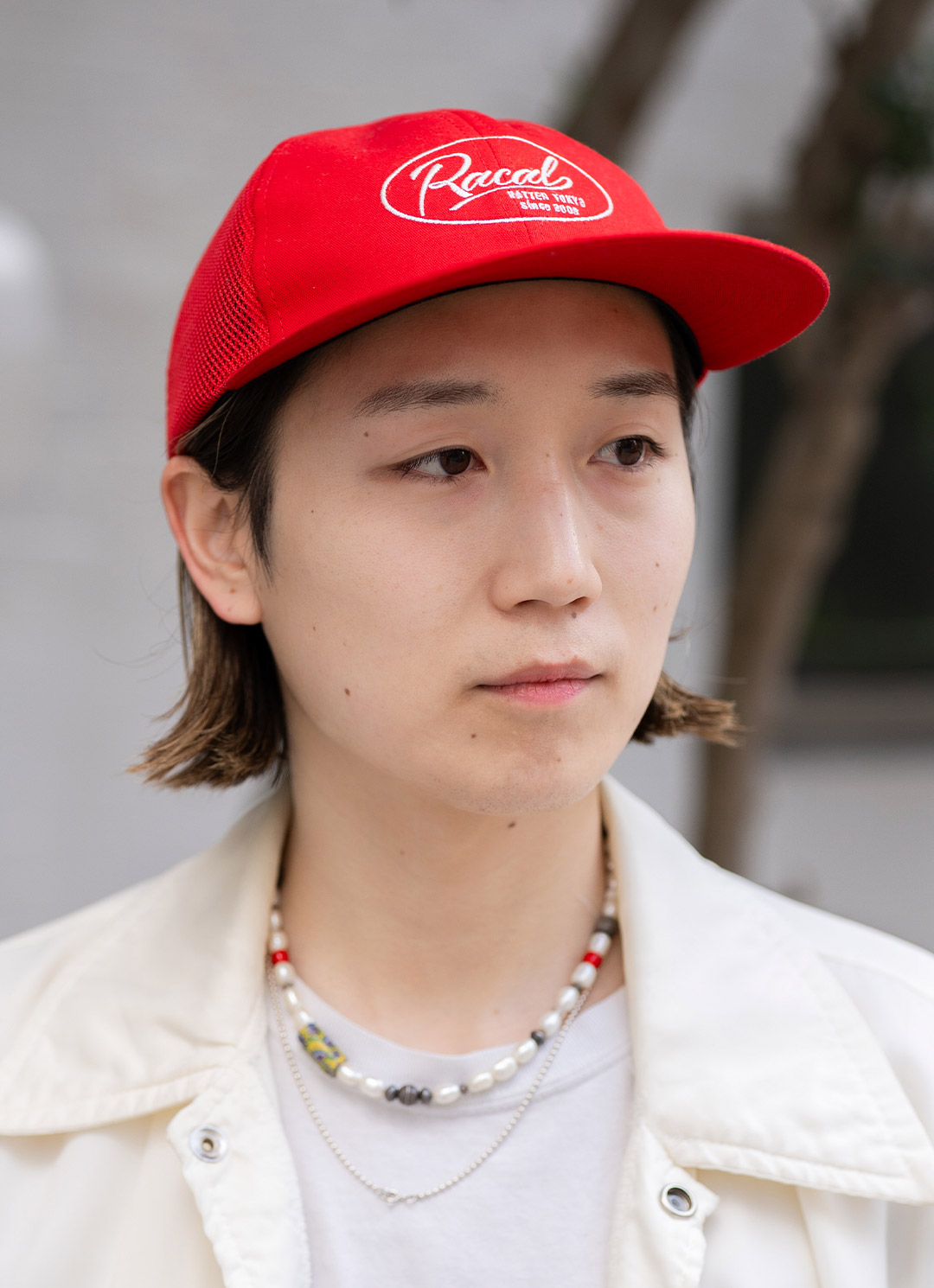 『ラカル』のレッドキャップで視線をキャッチ! 上品なネックレスレイヤードが、カジュアルすぎるのを抑えてくれる。