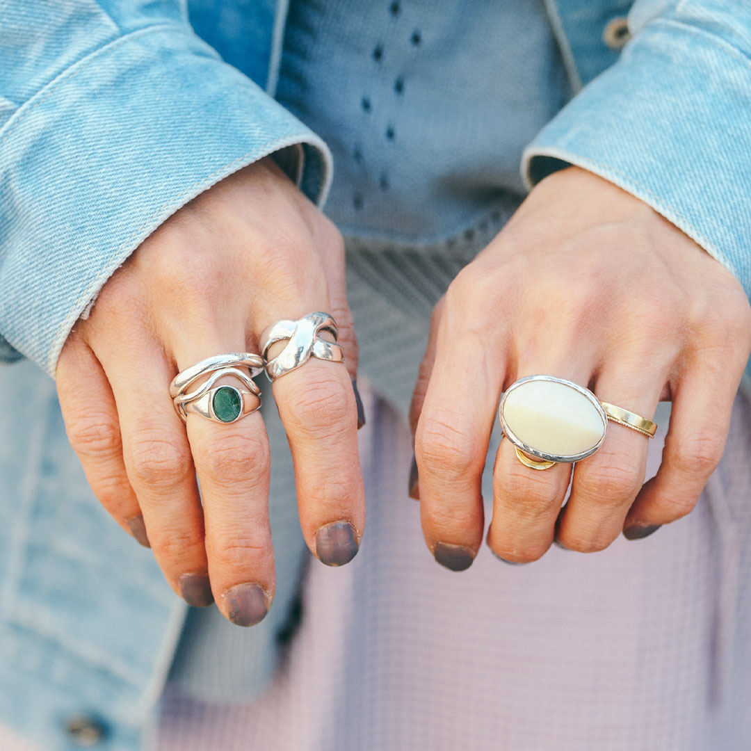 手元を彩るリングは、どれも存在感抜群! 唯一無二のデザインに、セレクトセンスが光るスタイリング。