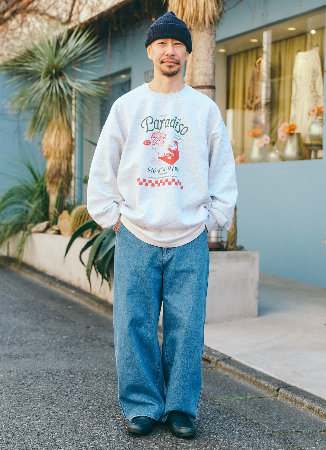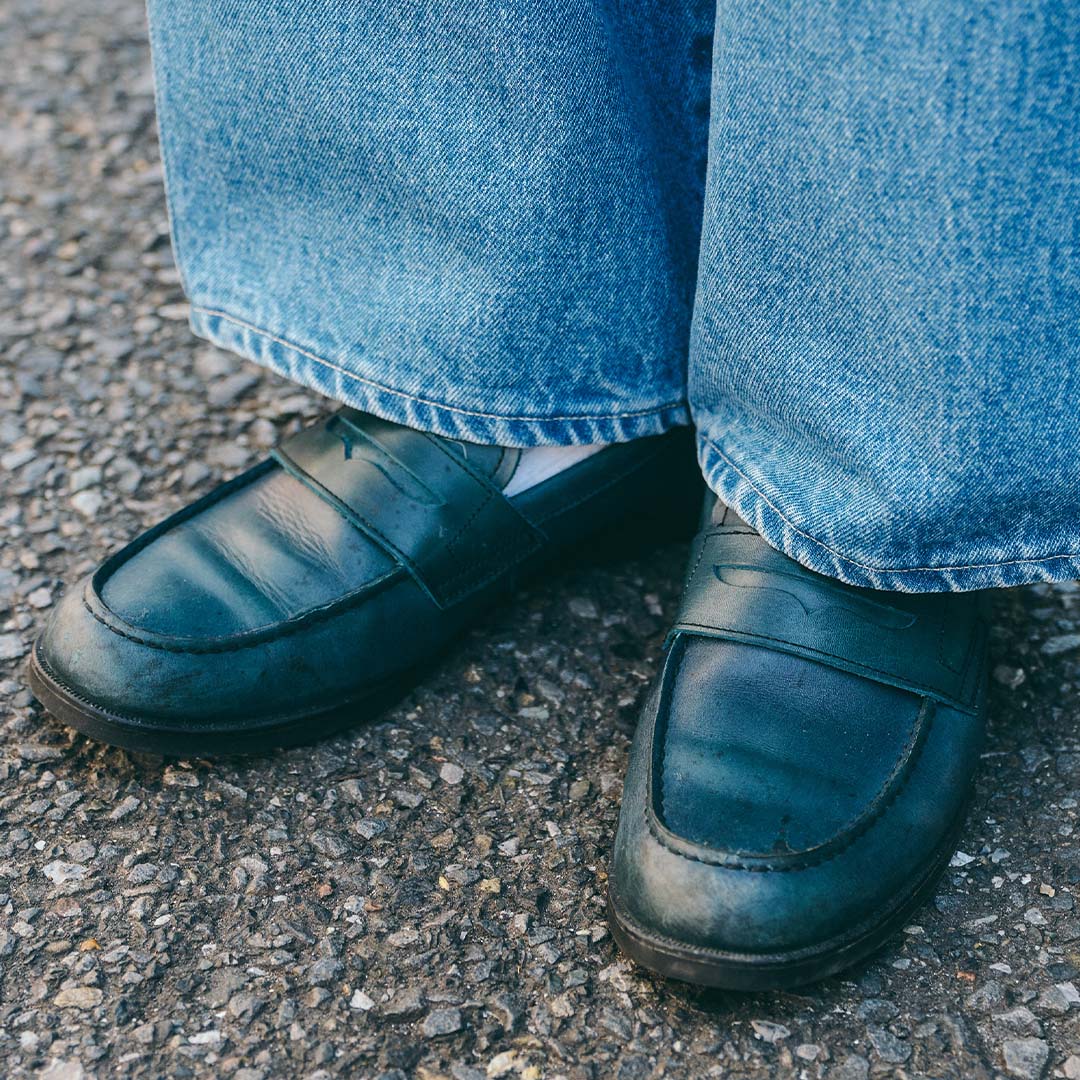 足元はローファーで品よく締めたのがグッド。ボトムスを少しの覗かせて、全体のバランスを取ったのはお見事。