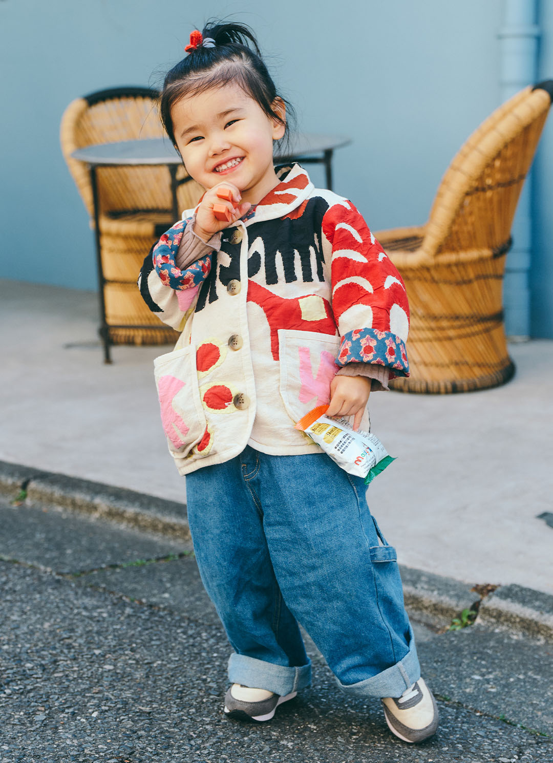 定番デニムは明るめブルーをセレクトして、春らしく着こなしたファミリーコーデ。ママパパの明るめトーンで揃えたのに対して、キッズのパッチワークジャケットが挿し色にぴったり。まだ肌寒い日が続き、ジャケットがマストなこの季節に、ぜひ参考にしたいスタイリング♪