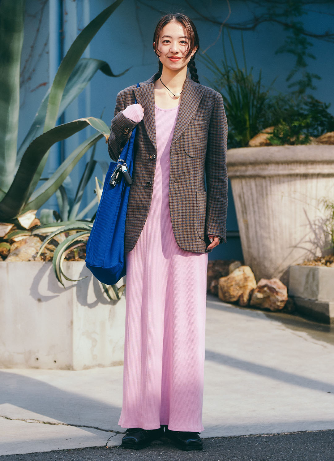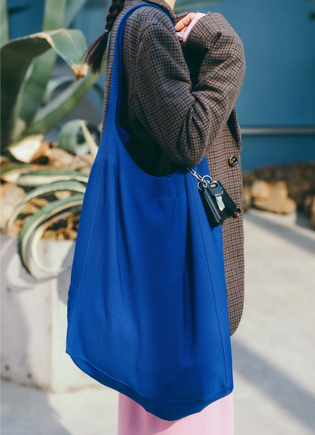 『AK+1』のトートバッグは、力強いブルーが魅力的! ジャケットの色味を拾って、統一感を出したのがポイント。