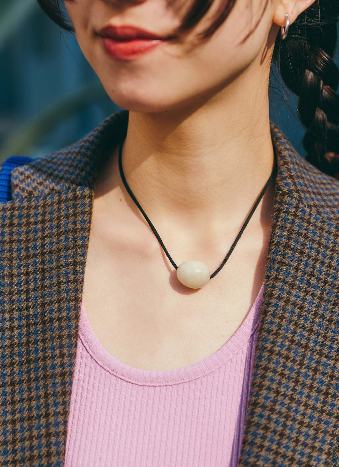 首元は『アニカ イネス』のコードネックレス。ころんとした丸みのあるモチーフが印象的で、やさしく映えるシンプルなデザイン。