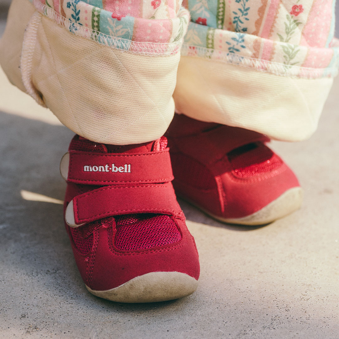 『モンベル』のレッドスニーカーが元気いっぱいの挿し色役に抜擢! パステルカラーのコーデが、より華やかに仕上がる。
