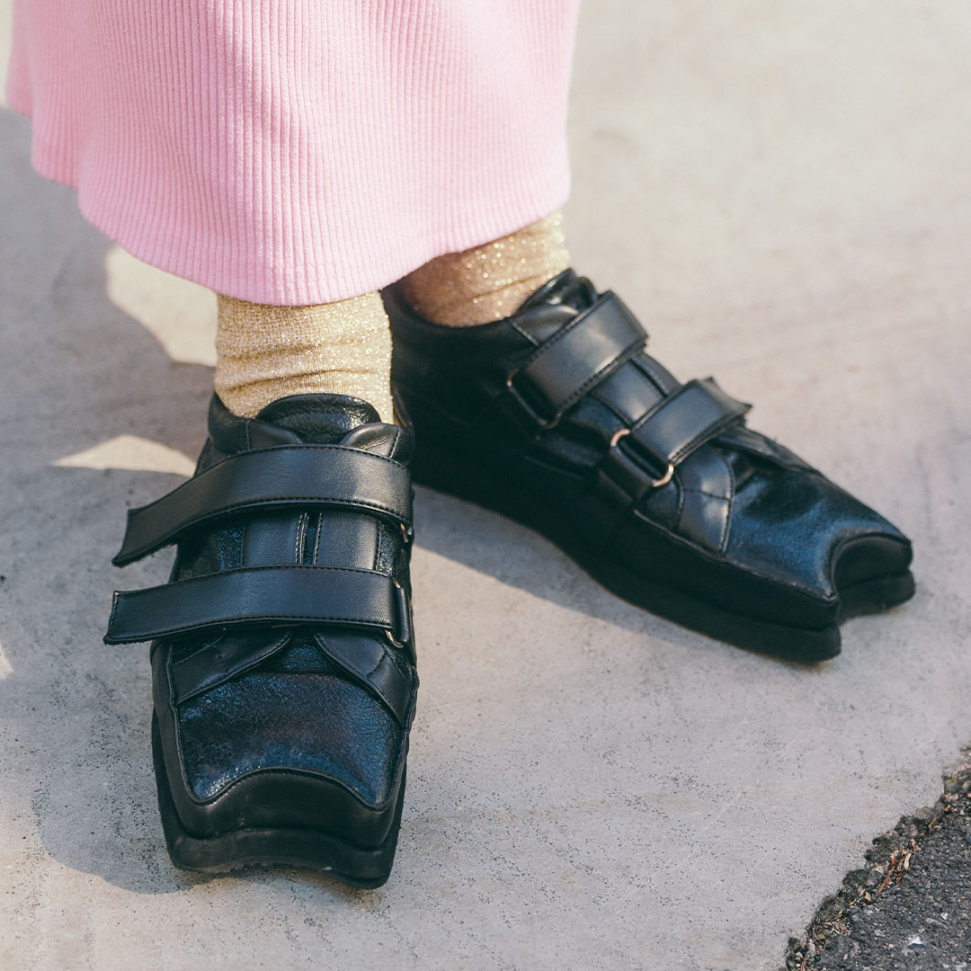 足元はモードなレザーシューズでメリハリをオン。春のきらめきを感じるラメソックスを合わせて、遊び心ある足元の完成!