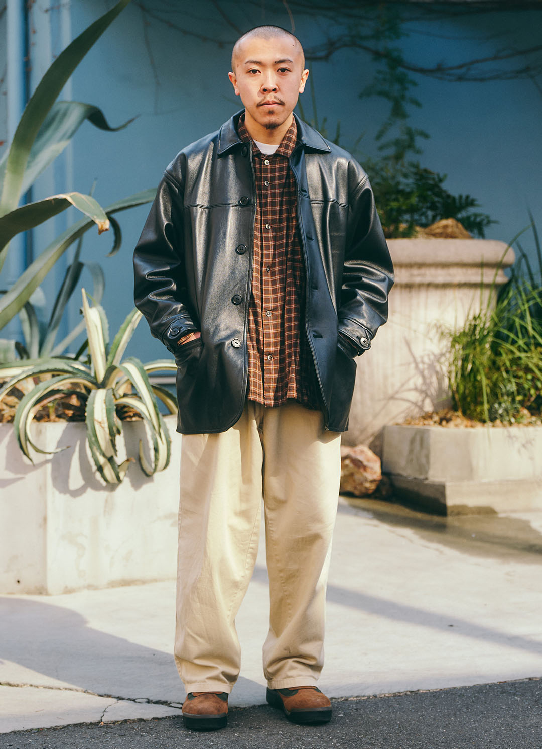 フィールドブーツを取り入れて、こなれ感たっぷりな足元。ブラウンレザーならではの味わいが感じられる一足。