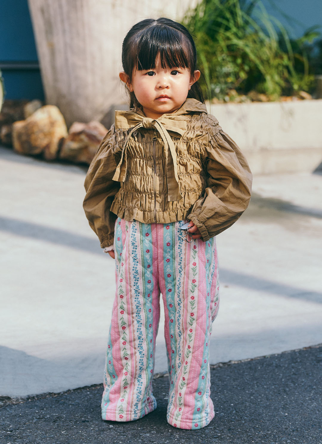 ピンク×ブラウンでつくるファミリーコーデは、チェック柄や花柄を挿して、春らしいリズミカルな装いに昇華。真っ青なバッグやレザージャケットと強めなアイテムをマイルドにして取り入れた、見事なスタイリングセンスは必見!