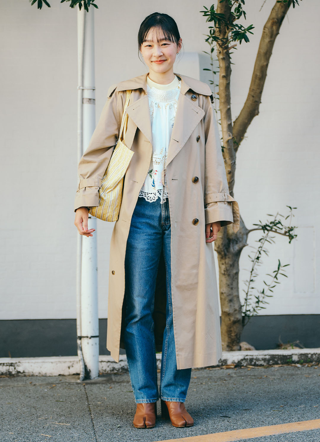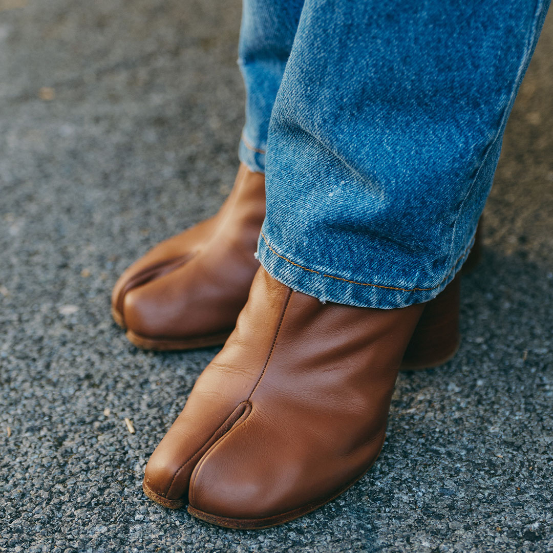 足元ははブラウンの『メゾン マルジェラ』のタビシューズ。カジュアルコーデに、洗練されたエッジを効かせてくれる。