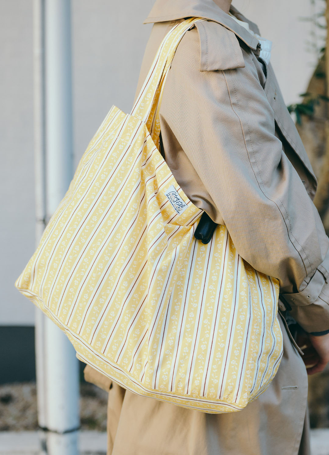 バターイエローのストライプ柄が春ムード満点な『ハウス オン ザ ヒル』のトートバッグ。キッズのボトムスとお揃いの生地というのもポイント!