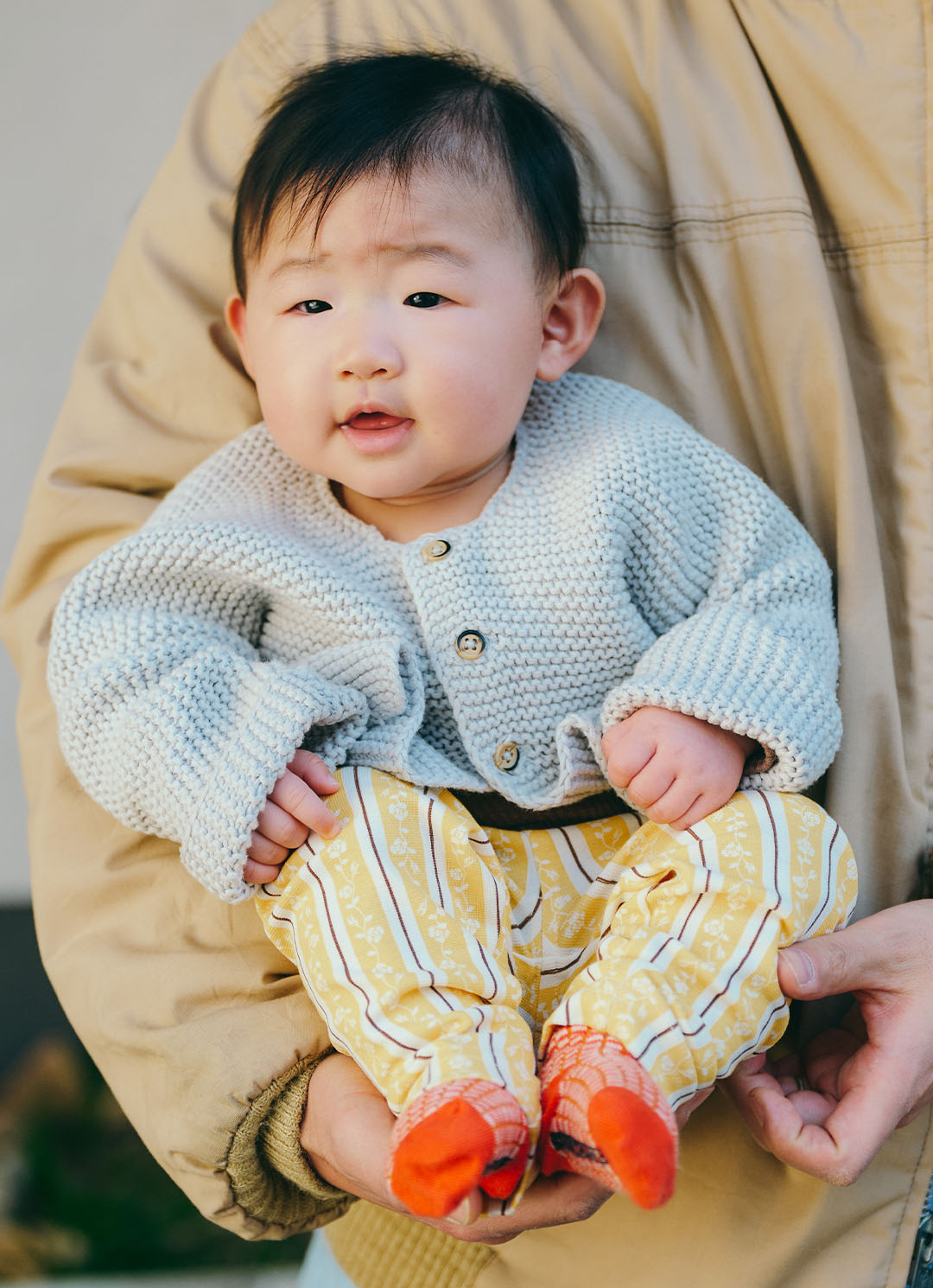 肌当たりのよい『プチバトー』のニットカーディガンに、ママのバッグとお揃いの柄ボトムスを合わせたベビーコーデ。ソックスが挿し色になってハッピームードを加速!