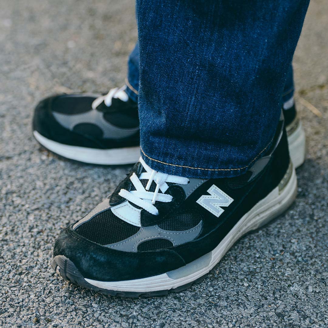 『ニューバランス』のスニーカーはブラックカラーをセレクト。デニムスタイルの足元を程よく引き締めてくれる素材感。
